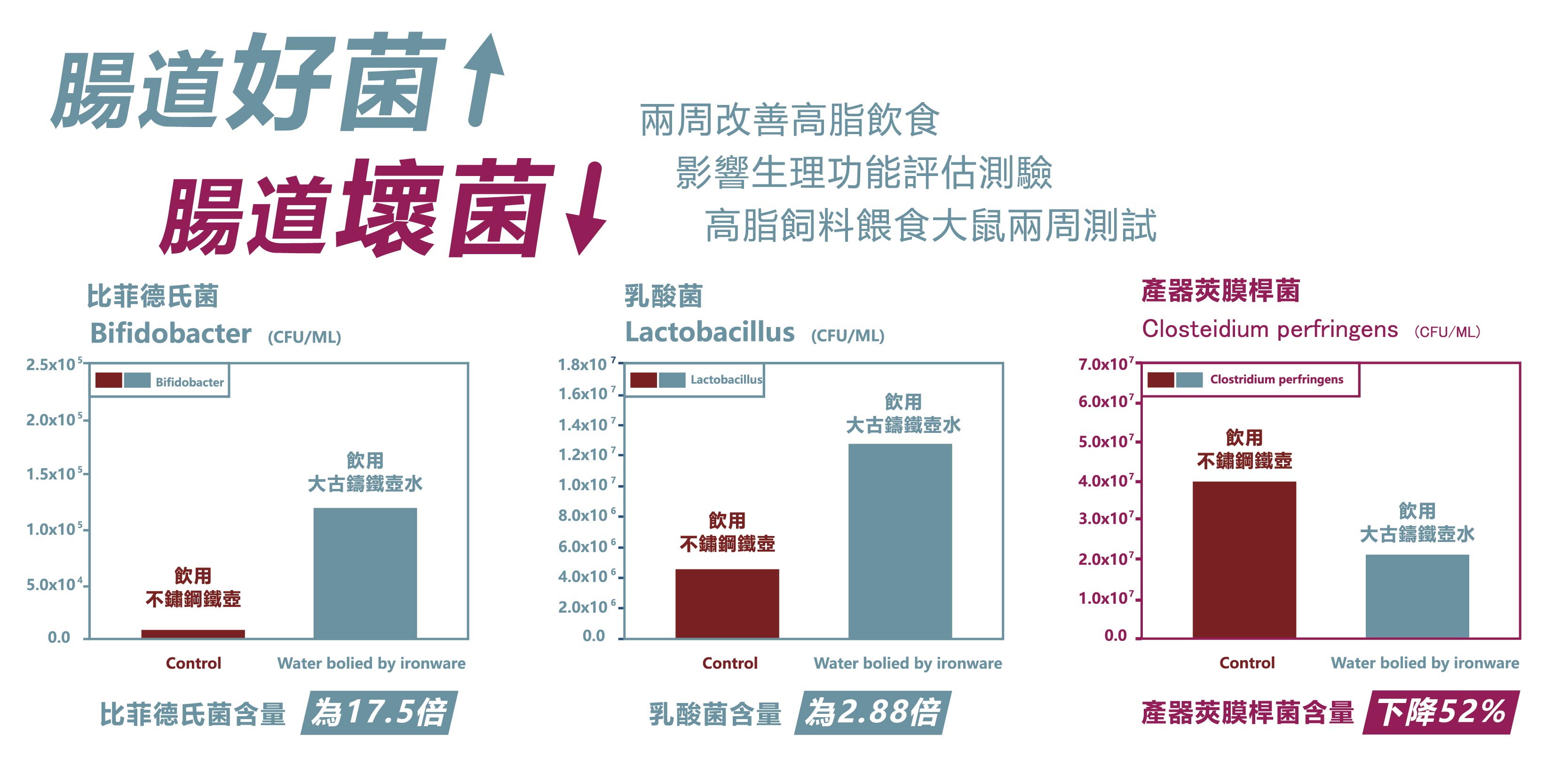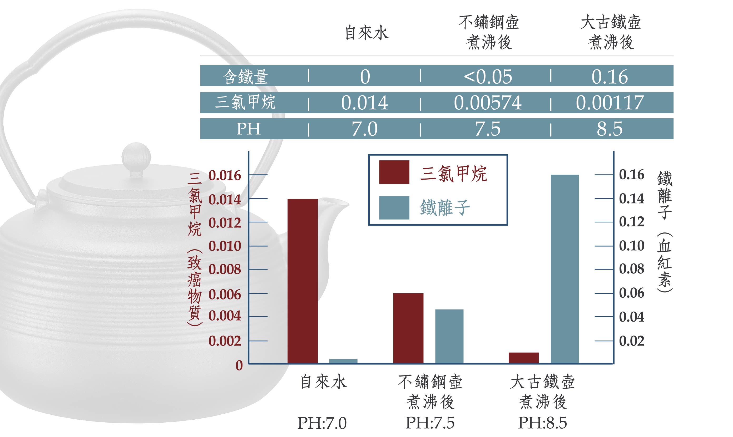 大古獨家二價鐵離子技術如圖證實自來水經大古鐵壺水煮沸後,可將致癌的三氯甲烷消除,並釋出大量鐵離子。二價鐵離子,分子小人體容易吸收,除了促進增加血液紅血球攜氧量,水也會變成軟水與弱鹼性甘甜好入喉。
