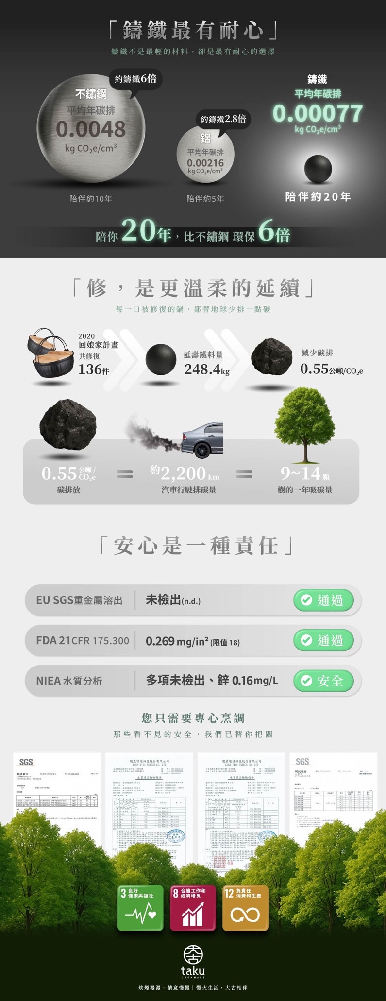 無塗層鑄鐵鍋的鍋面,是會直接接觸到食材的,因此,大古堅持不使用回收鐵,只使用無重金屬汙染、無輻射殘留的100%原生鐵礦,除了鐵礦進口時檢附的檢驗證明外,更自主成立實驗室、購置專業分光儀,確定每次澆鑄前的原料含量只有95%鐵、3%碳、2%矽才會使用。
