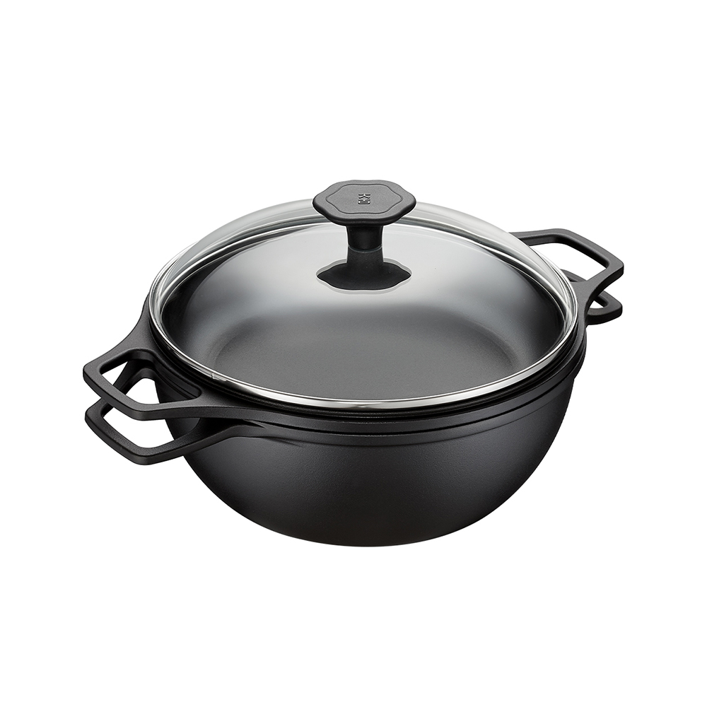 捨棄傳統砂模鑄造,改用「陶瓷脫蠟鑄造」,鑄造出來的鐵器毛孔較傳統鐵器小、表面光滑;結構緻密堅固,烹煮後可冷水刷洗,不因溫差產生破損。碳化油膜開鍋層與純粹的生鐵,天然不怕刮。安心使用鐵鏟料理,不怕刮傷鐵鍋。