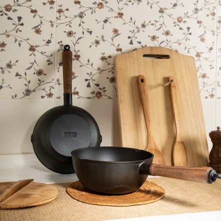 捨棄傳統砂模鑄造,改用「陶瓷脫蠟鑄造」,鑄造出來的鐵器毛孔較傳統鐵器小、表面光滑;結構緻密堅固,烹煮後可冷水刷洗,不因溫差產生破損。碳化油膜開鍋層與純粹的生鐵,天然不怕刮。安心使用鐵鏟料理,不怕刮傷鐵鍋。