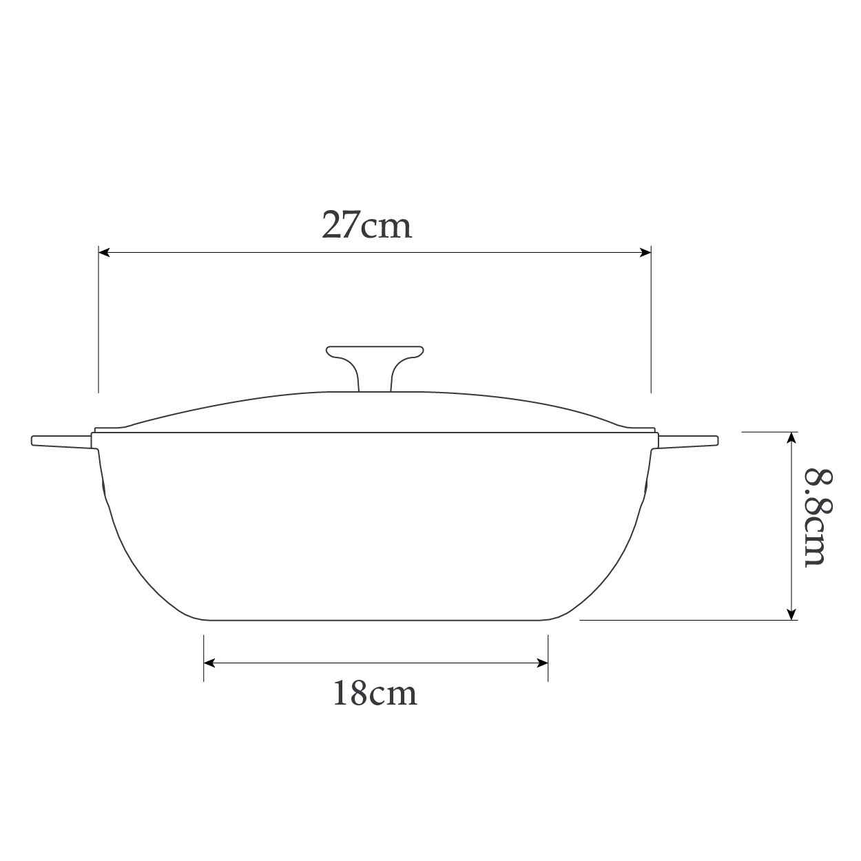 | 尺寸 | 鍋緣直徑27cm;鍋底直徑18cm;鍋高8.8cm;鍋耳12cm x 4.5cm;總長37cm |