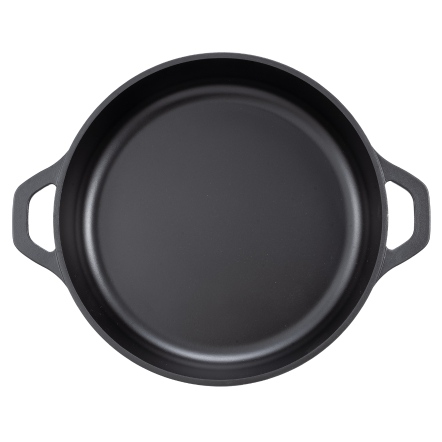 捨棄傳統砂模鑄造,改用「陶瓷脫蠟鑄造」,鑄造出來的鐵器毛孔較傳統鐵器小、表面光滑;結構緻密堅固,烹煮後可冷水刷洗,不因溫差產生破損。碳化油膜開鍋層與純粹的生鐵,天然不怕刮。安心使用鐵鏟料理,不怕刮傷鐵鍋。