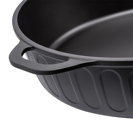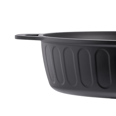 捨棄傳統砂模鑄造,改用「陶瓷脫蠟鑄造」,鑄造出來的鐵器毛孔較傳統鐵器小、表面光滑;結構緻密堅固,烹煮後可冷水刷洗,不因溫差產生破損。碳化油膜開鍋層與純粹的生鐵,天然不怕刮。安心使用鐵鏟料理,不怕刮傷鐵鍋。